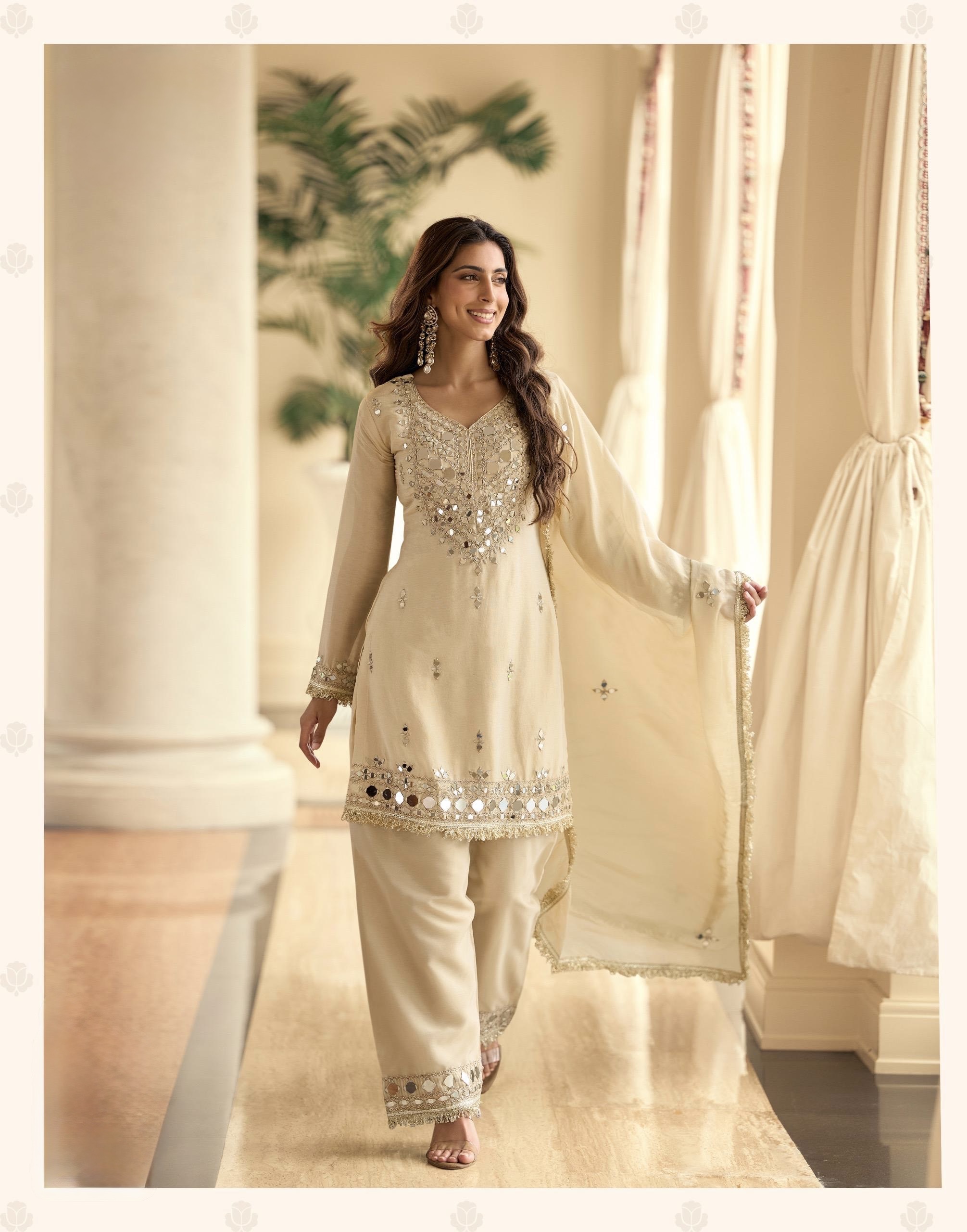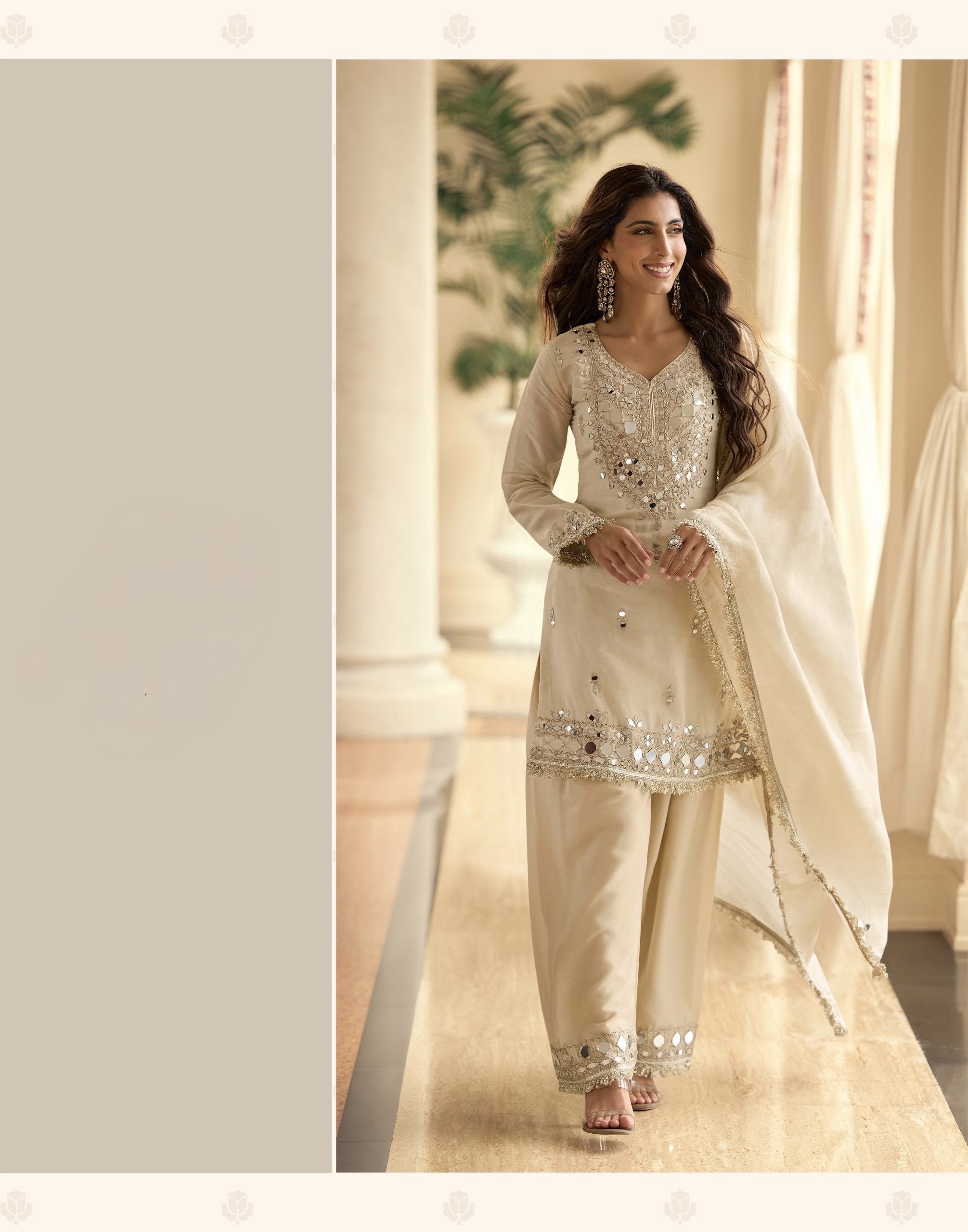 FABRIC PREMIUM SIMAR SILK TORA SILK CREP SILK ( LATEST TRENDY HAND ORIGNAL MIRROR EMBROIDERED TOP WITH PLAZZO AND DUPATTA )