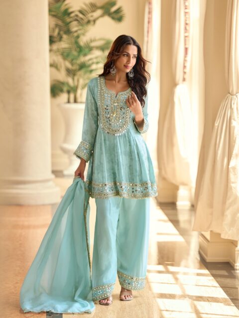 FABRIC PREMIUM SIMAR SILK TORA SILK CREP SILK ( LATEST TRENDY HAND ORIGNAL MIRROR EMBROIDERED TOP WITH PLAZZO AND DUPATTA )