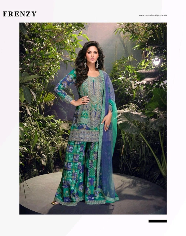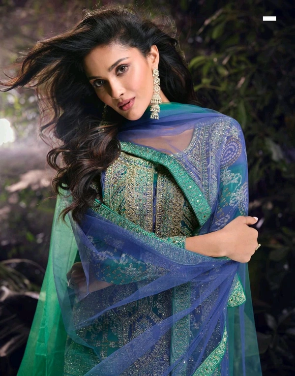 FABRIC PREMIUM REAL CHINON SILK HEAVY LOOK EMBROIDERED TOP WITH HAND MIRROR WORK AND EMBROIDERED PLAZZO WITH EMBROIDERED NET DUPATTA