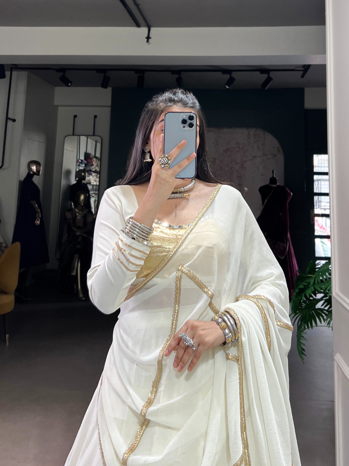 Blouse Work Embossed Design And Original Mirror With Gotta Patti Lace Touch Up