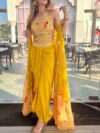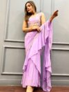 READY TO WEAR PRINTED RUFFLE SAREE, DESIGNER BLOUSE EMBELLISHED WITH ZARI RESHAM AND FOIL MIRROR WORK, INCLUDES EMBROIDIED WAIST BELT